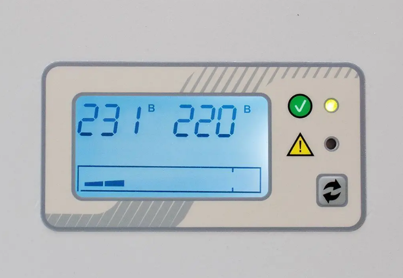 На дисплее можно менять значение выходного напряжения в диапазоне 220-230 В с шагом в 1 В (настройка выполняется после переключения на цепь ручного байпаса).